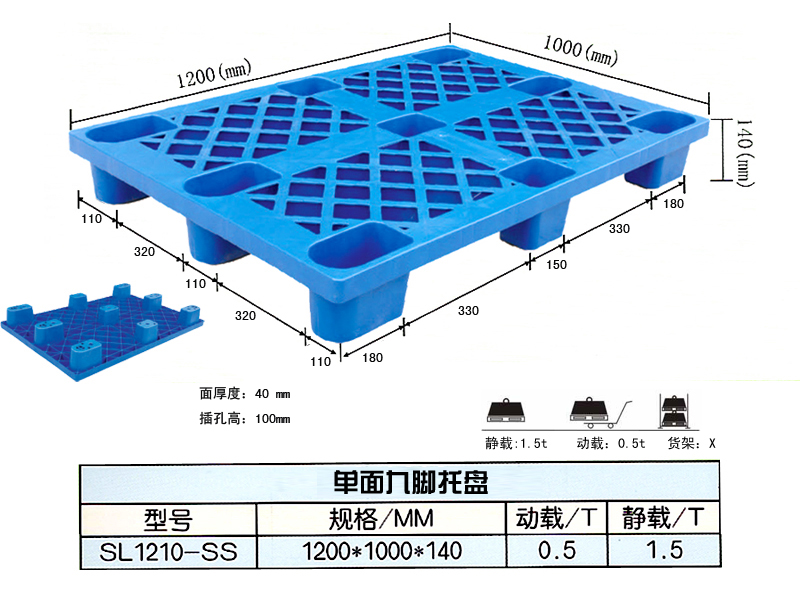 注:九腳網(wǎng)格托盤(pán)內(nèi)部可加入鋼管,是為了達(dá)到增加承載的目的,延長(zhǎng)托盤(pán)的使用壽命,塑料托盤(pán)如要在低溫環(huán)境中長(zhǎng)期使用,要選擇全新料生產(chǎn)的產(chǎn)品。